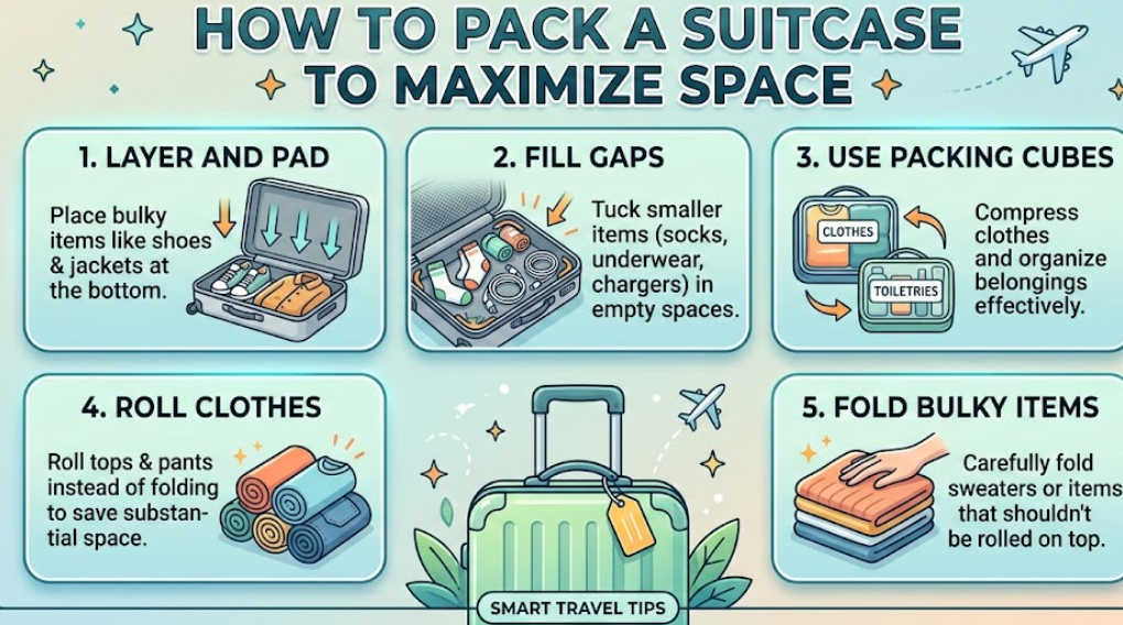 Many travelers struggle with limited luggage space, airline baggage restrictions, and keeping items organized while traveling. By applying proven packing strategies used by frequent travelers and travel experts, you can maximize suitcase space and keep your belongings neatly arranged.